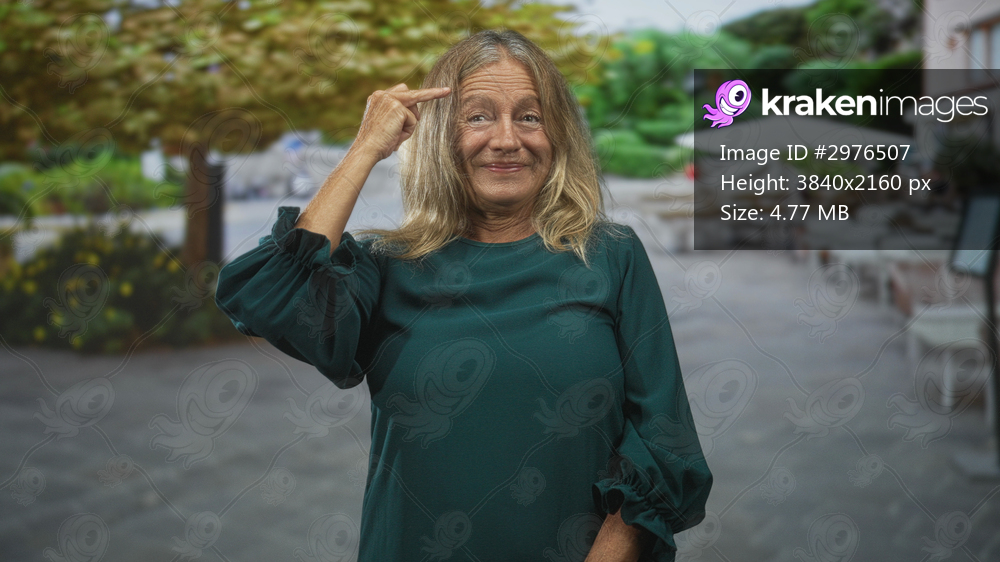 Senior woman points finger to temple with a smile at an outdoor street cafe terrace, visible hand and face, wearing green dress; thoughtful curiosity.