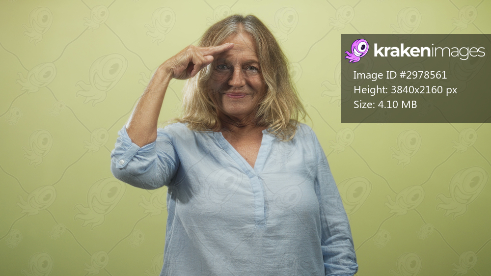 Senior woman points finger to temple in a studio against a pale green backdrop, smiling and relaxed; quiet confidence.