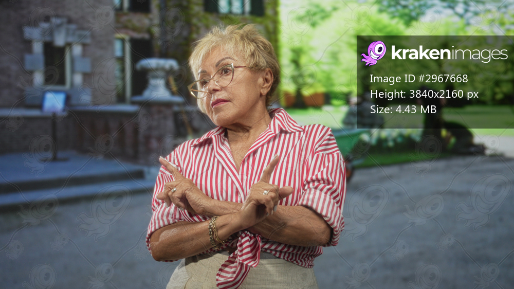 Senior woman points fingers with both hands and shrugs, wearing red striped shirt tied at waist in front of building; playful.