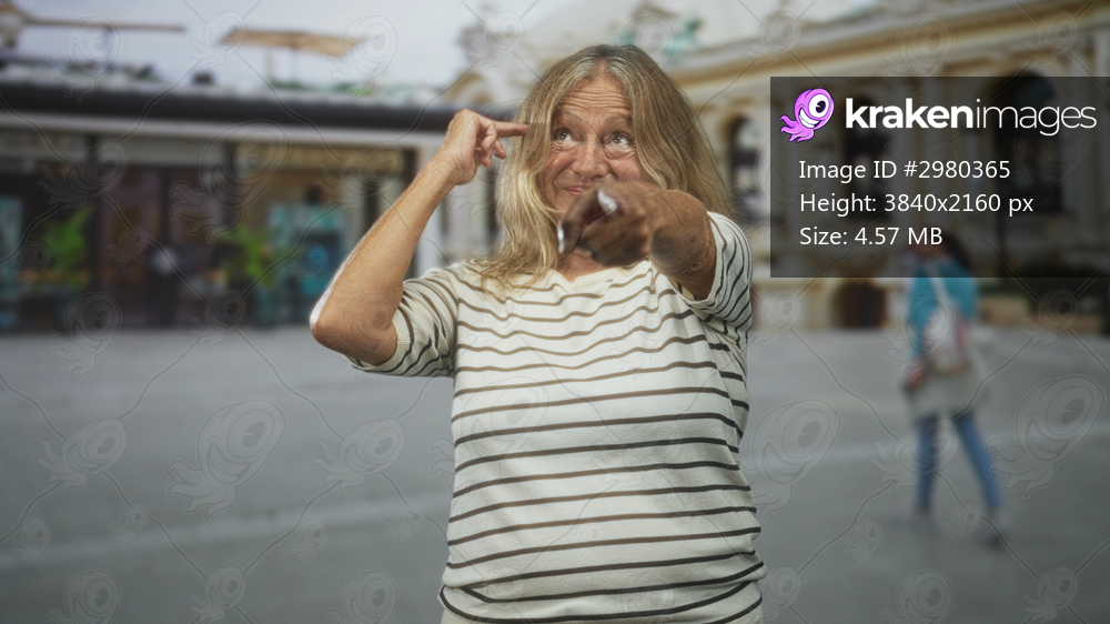 Senior woman points index finger at camera and taps temple while wearing a striped shirt in a busy street plaza with historic building facades; playful thinking. - Kraken Images