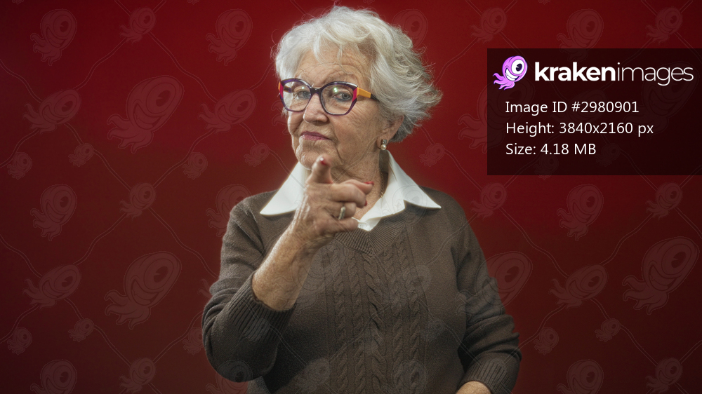 Senior woman points index finger near cheek while crossing arms, wearing glasses and brown sweater against red studio wall; confidence wisdom.
