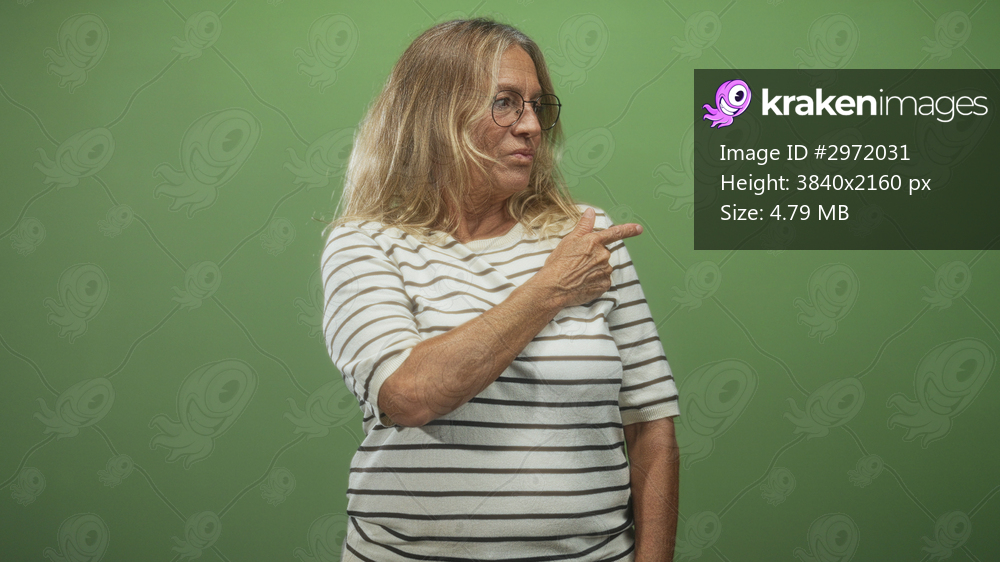 Senior woman points index finger to the side in studio, wearing striped shirt and round glasses against a green backdrop; calm contemplation.
