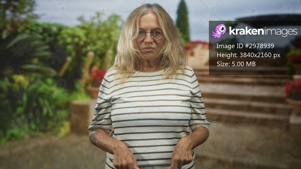 Senior woman points index fingers down at stone stairs in building, wearing striped shirt and glasses; defiance stoicism.