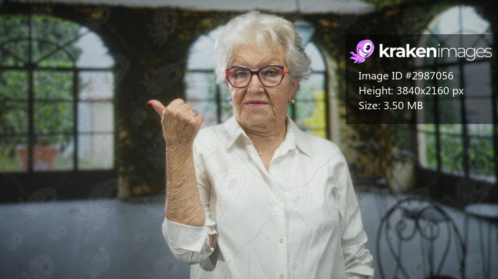 Senior woman points thumb back wearing colorful glasses in a sunlit conservatory building; warm joy.