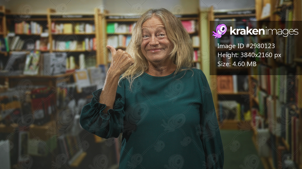 Senior woman points thumb over shoulder at bookstore shelves, smiling in green blouse; amused curiosity.