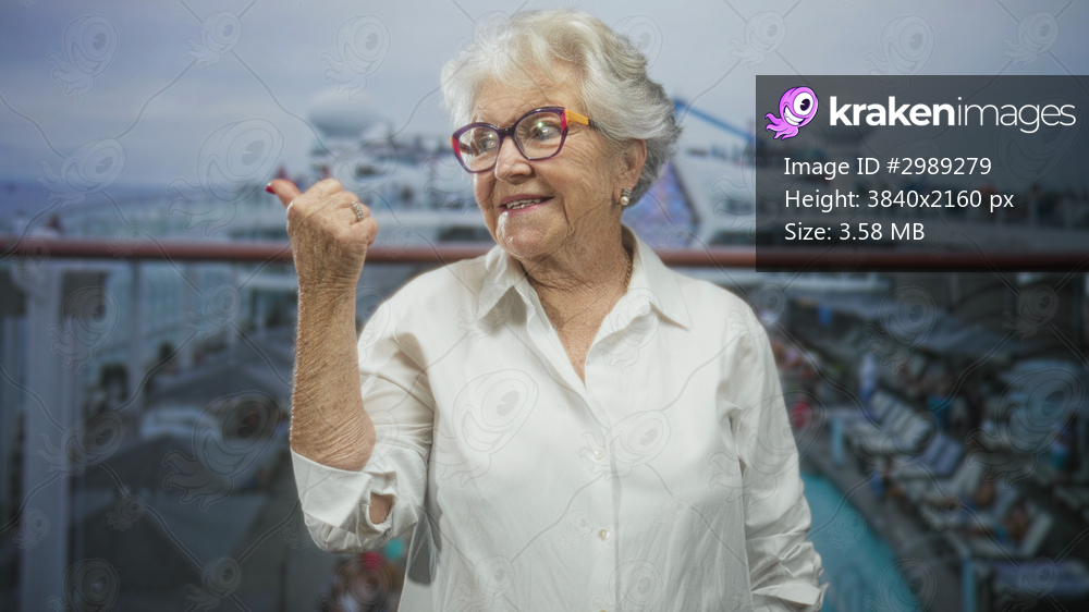 Senior woman points thumb to ship deck, hand raised near chest, wearing glasses and white shirt; quiet contentment.