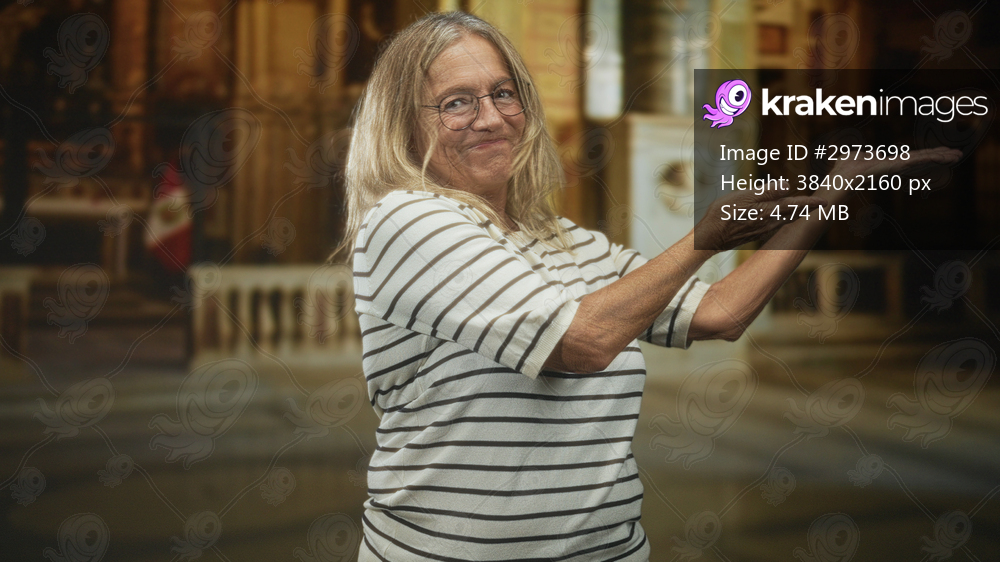 Senior woman presenting open palms and smiling in a striped shirt inside an ornate building; grace contentment.