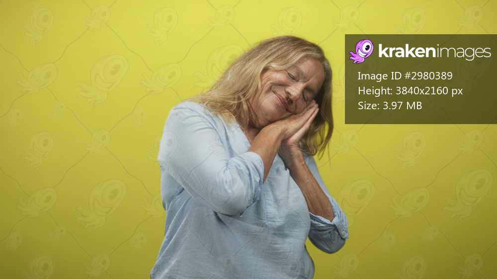Senior woman presses hands together by cheek in studio with yellow backdrop, smiling eyes closed; contentment.