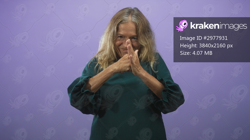 Senior woman presses palms together in prayerlike gesture, hands visible, wearing green dress against purple studio backdrop; contemplation gratitude calm. - Kraken Images