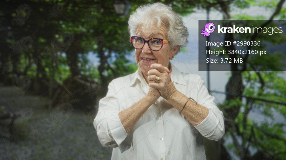 Senior woman presses palms together near chest, colorful glasses and red nails visible, on a tree lined forest path by water; gentle contentment.