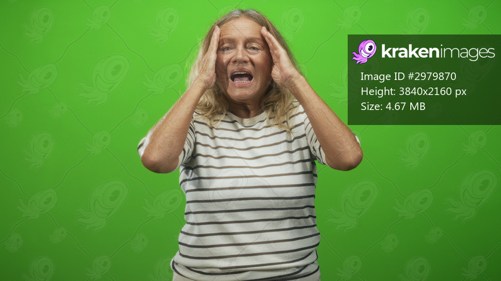 Senior woman pressing forehead with hands, mouth open and shouting, wearing striped shirt while standing against green studio screen; headache distress. - Kraken Images