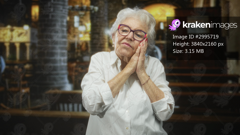 Senior woman pressing hands to cheek in a sleepy resting gesture inside an old church with pews and columns; restful peace.