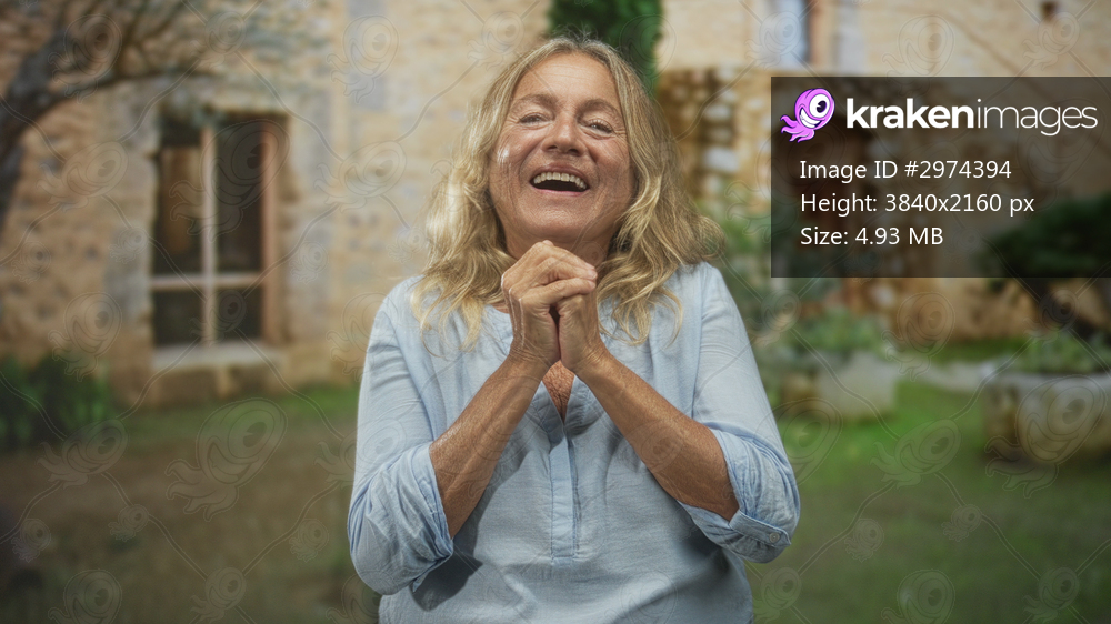Senior woman pressing hands to cheeks and laughing in a stone building courtyard with sunlight and a blue shirt; joy gratitude.
