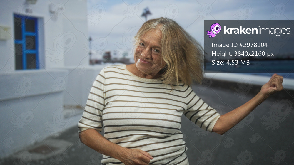 Senior woman with raised hand and open arm gesture laughing on a coastal street beside white building and seawall, wearing striped shirt; joy.