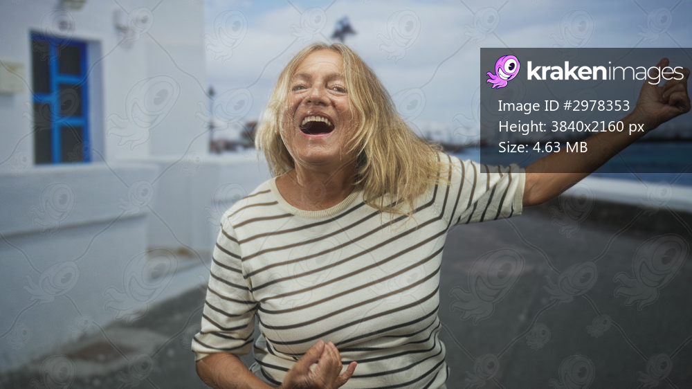 Senior woman with raised hand and open arm gesture laughing on a coastal street beside white building and seawall, wearing striped shirt; joy.
