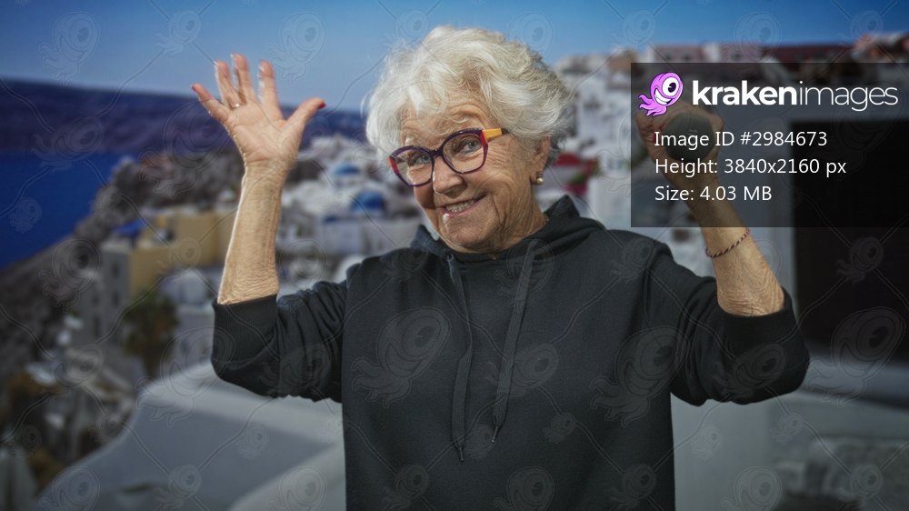 Senior woman raises a 1kg dumbbell in her right hand and lifts both arms on a terrace overlooking santorini white buildings and sea; joy vitality strength. - Kraken Images