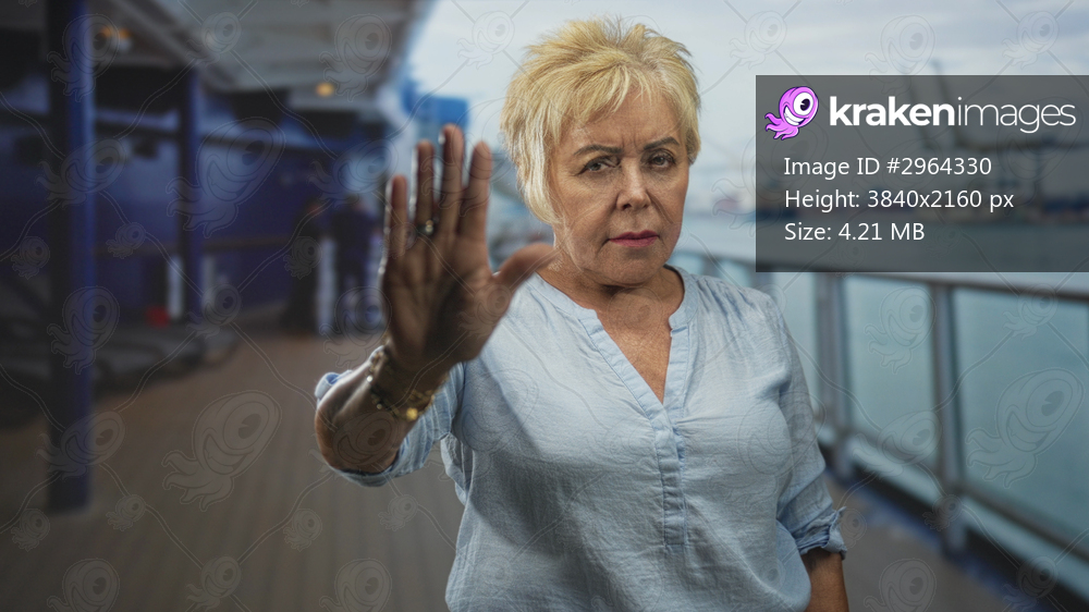 Senior woman raises an open hand palm out to stop, standing on a ship deck near railing and cranes in a building setting; firm defiance.