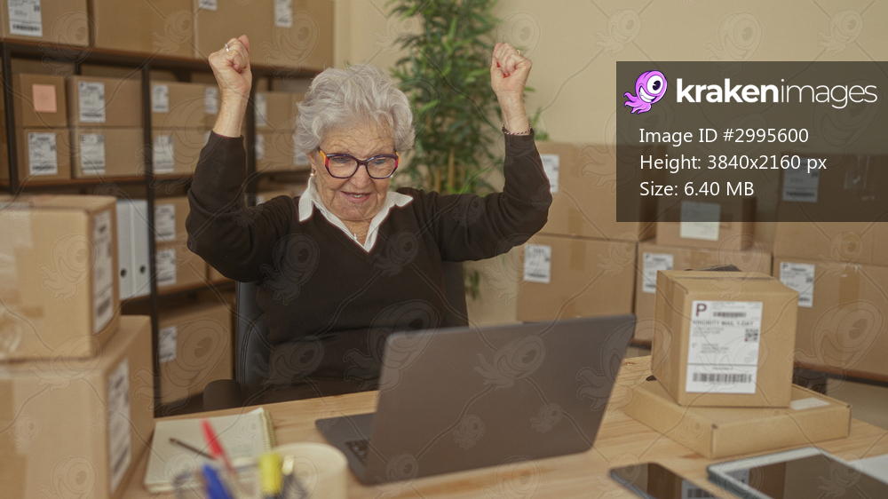 Senior woman raises fists at laptop amid stacked shipping boxes and labels on shelves in a building; entrepreneurial pride.