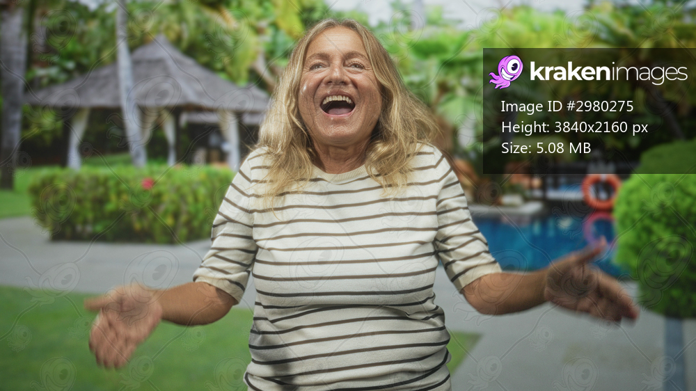 Senior woman raises hands at resort pool wearing a striped shirt, smiling and laughing with arms raised and visible forearms; joy relaxation celebration contentment. - Kraken Images