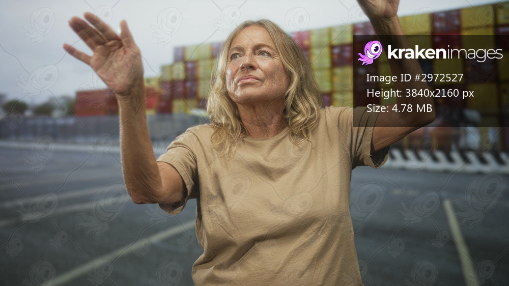 Senior woman raises hands reaching toward stacked shipping containers on a street; hope resilience strength.