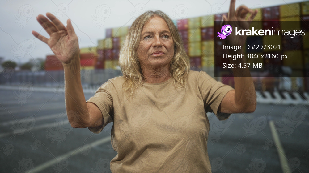 Senior woman raises hands reaching toward stacked shipping containers on a street; hope resilience strength.