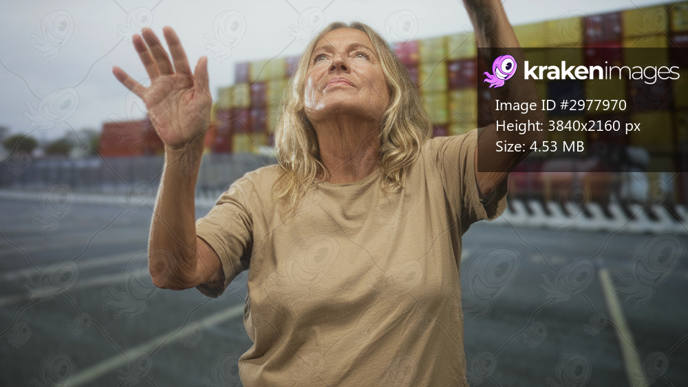 Senior woman raises hands reaching toward stacked shipping containers on a street; hope resilience strength.