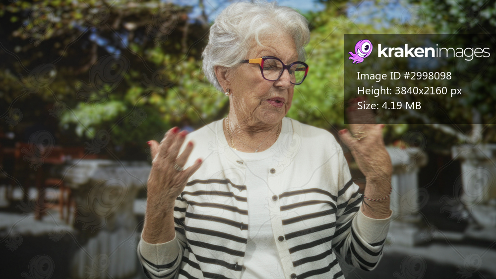 Senior woman raises hands with red nails in an expressive gesture on a street courtyard; quiet serenity.
