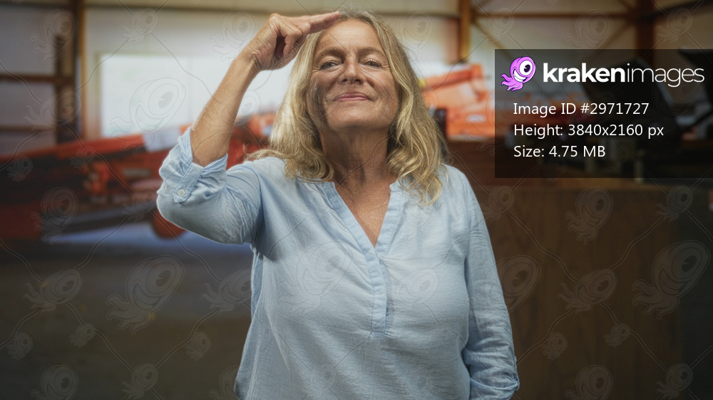 Senior woman raising arm and pointing index finger to temple beside an orange airplane inside an airport hangar; confidence resilience.