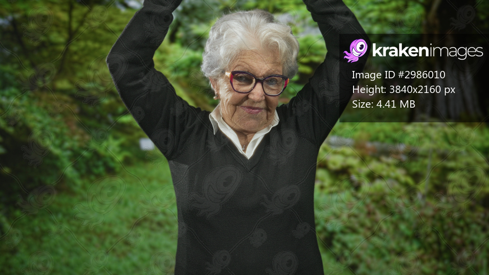 Senior woman raising hands above head in forest wearing glasses and black sweater, silver hair and slight smile; gentle joy.