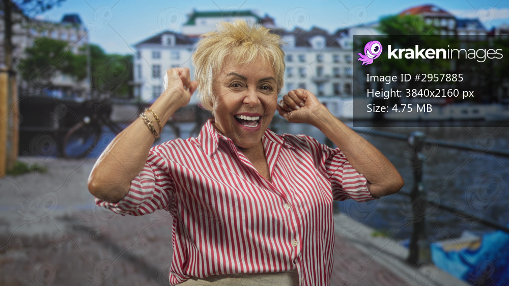 Senior woman raising hands and smiling in striped blouse by street canal with railing and boats visible; joy celebration.
