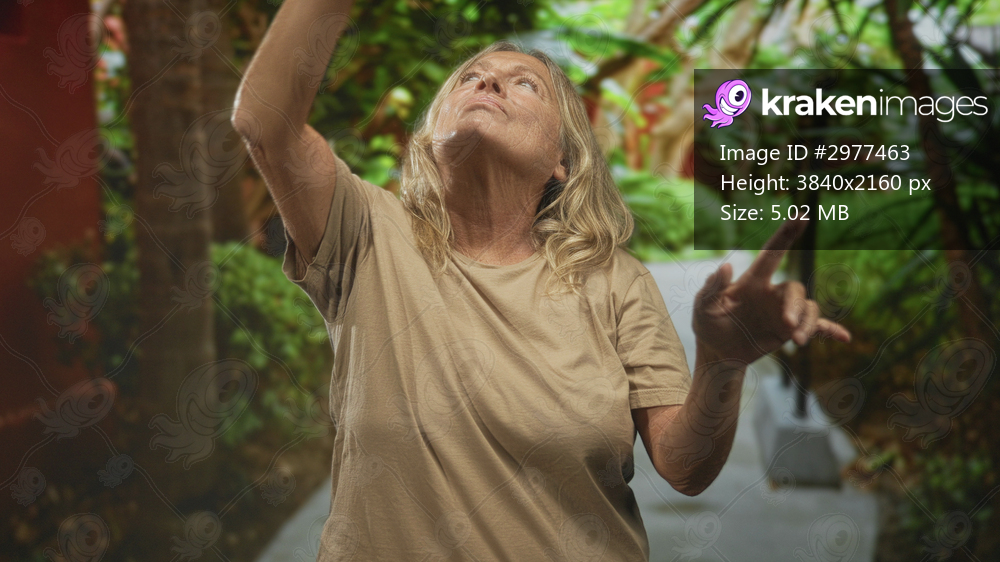 Senior woman reaching up with hand and pointing finger toward trees in a building courtyard garden pathway, beige tshirt visible, head tilted upward; curiosity discovery. - Kraken Images