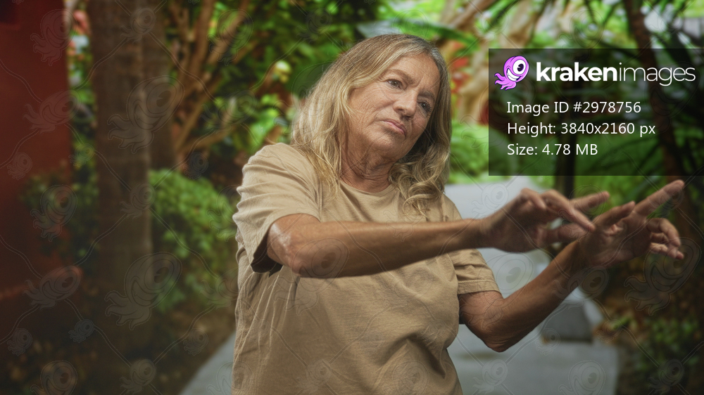 Senior woman reaching up with hand and pointing finger toward trees in a building courtyard garden pathway, beige tshirt visible, head tilted upward; curiosity discovery. - Kraken Images