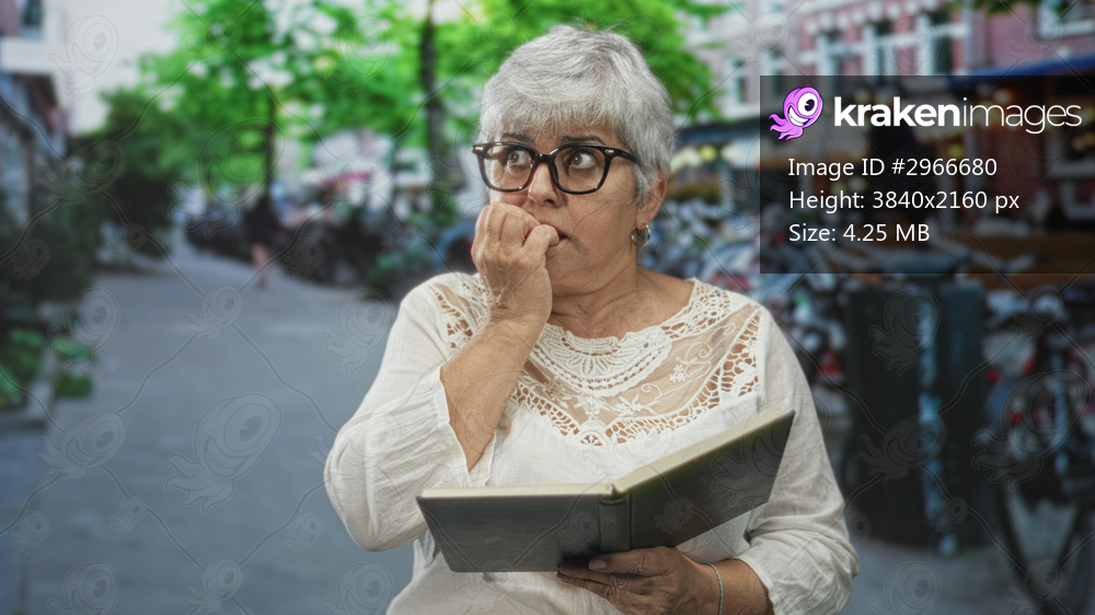 Senior woman reader with grey hair holds open book and bites fingernail with left hand on a city street lined with bicycles and cafes; anxiety.