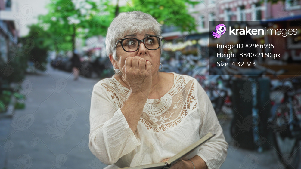 Senior woman reader with grey hair holds open book and bites fingernail with left hand on a city street lined with bicycles and cafes; anxiety.