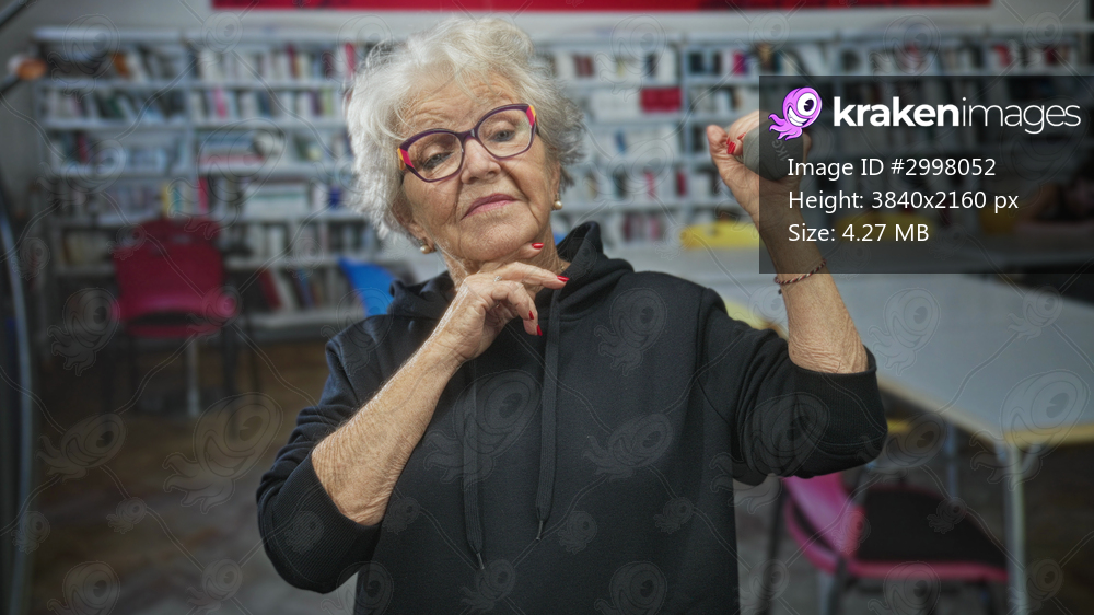 Senior woman right hand holds dumbbell in a library building, thoughtful chin touch gesture and raised weight; confidence vitality.