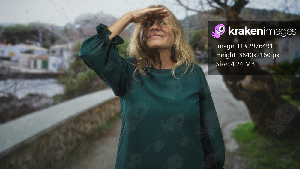 Senior woman shielding eyes with hand on street seafront path by stone wall and gnarled tree, smiling while looking toward water; contentment reflection. - Kraken Images