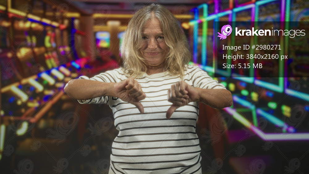 Senior woman showing thumbs down with hands and forearms visible in a slot machine casino aisle; disappointment.