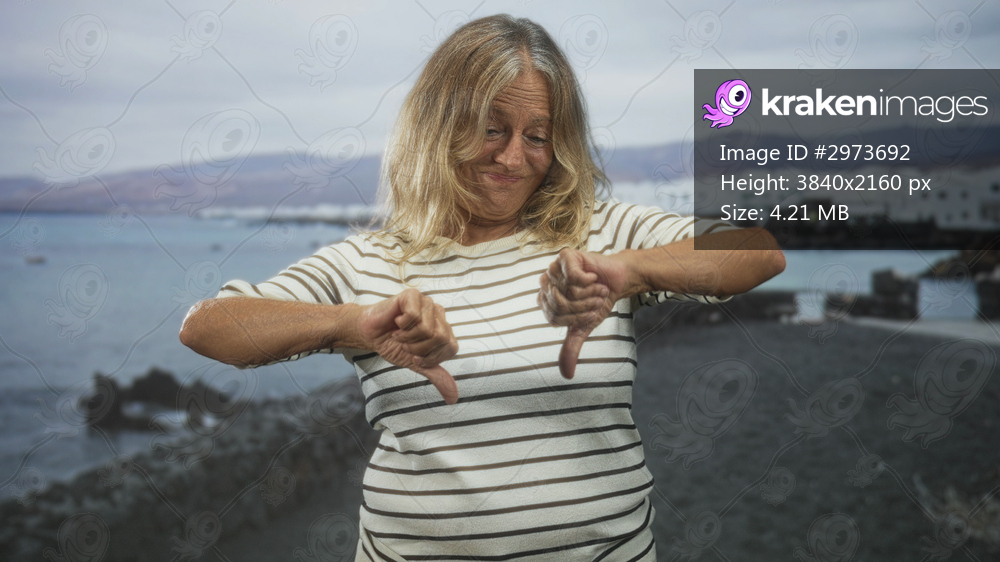 Senior woman shows alternating thumbs down and thumbs up with hands extended at building on rocky beach coast; ambivalence.