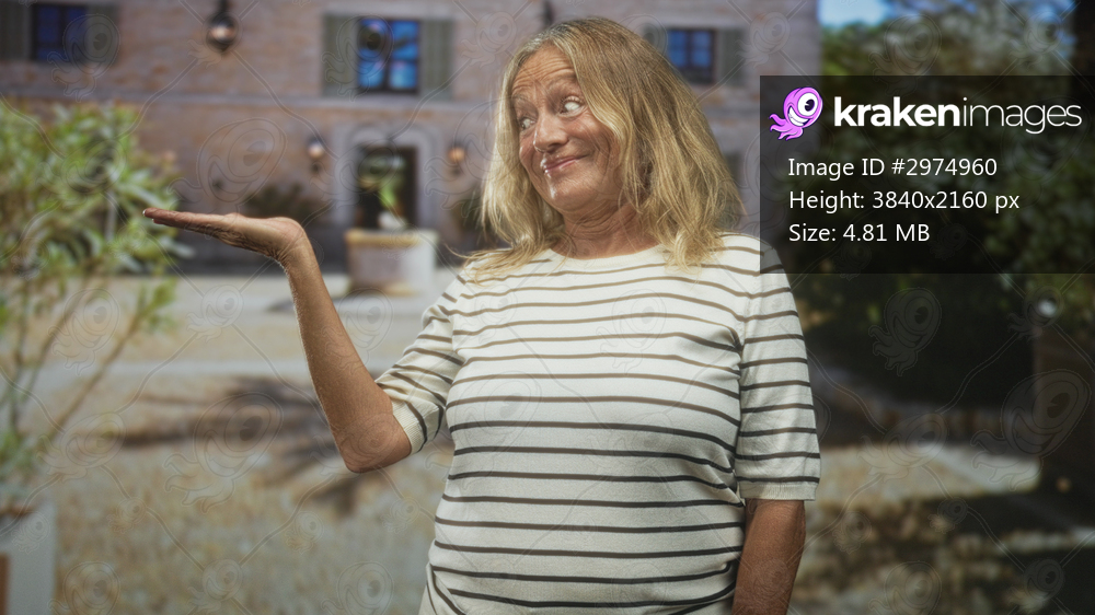 Senior woman shows palm up gesture and relaxed smile while standing in a building courtyard wearing a striped shirt; contentment.