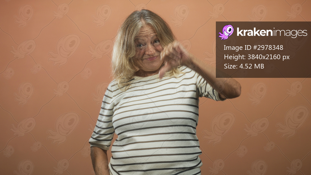Senior woman shows thumbs down with visible thumb and hand, wearing striped shirt in studio; disapproval wry confidence.