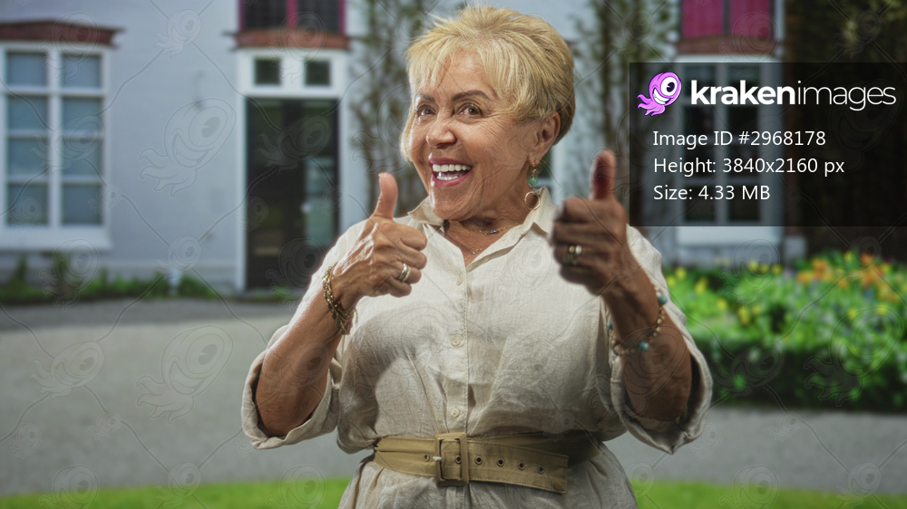 Senior woman shows two thumbs up gesture and smiling face in front of building with garden and windows; joy confidence.