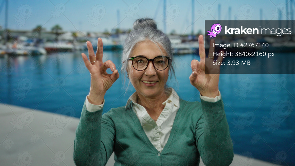 Senior woman smiling by the seaside with boats at port, making okay gesture, wearing glasses, grey hair in an outdoor scenic view, perfect for capturing nautical vibes. - Kraken Images