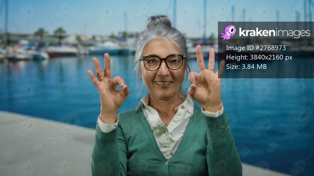 Senior woman smiling by the seaside with boats at port, making okay gesture, wearing glasses, grey hair in an outdoor scenic view, perfect for capturing nautical vibes. - Kraken Images