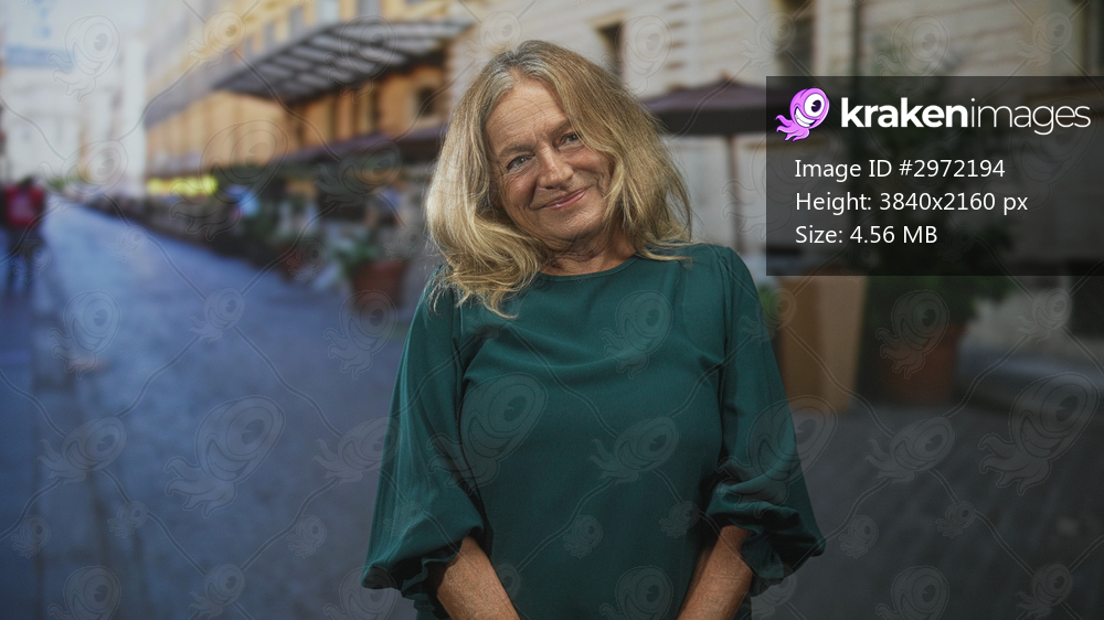 Senior woman smiling with face visible and hands loosely clasped in green blouse on cobblestone street cafe; gentle serenity.