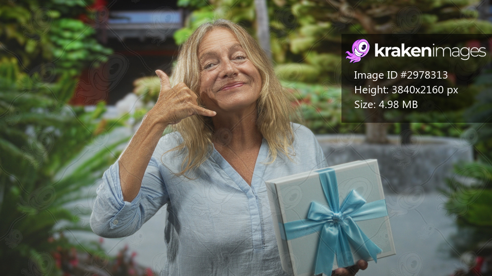 Senior woman smiling holding wrapped gift box with blue ribbon points finger at camera in a building courtyard near manicured bonsai plants; playful invitation. - Kraken Images