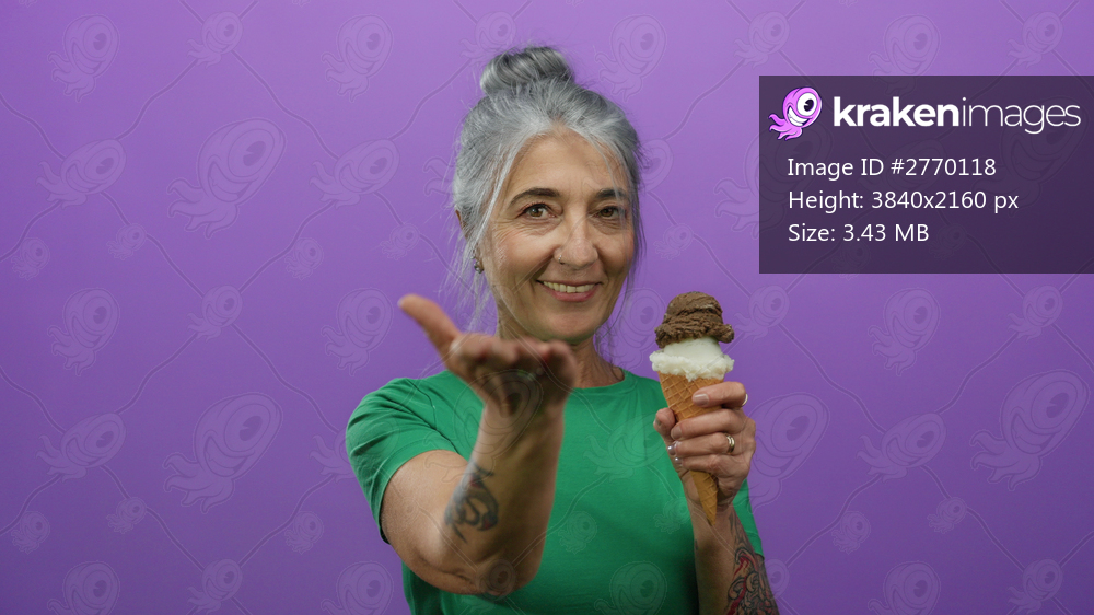Senior woman smiling with ice cream cone, extending hand towards camera against isolated purple wall background.