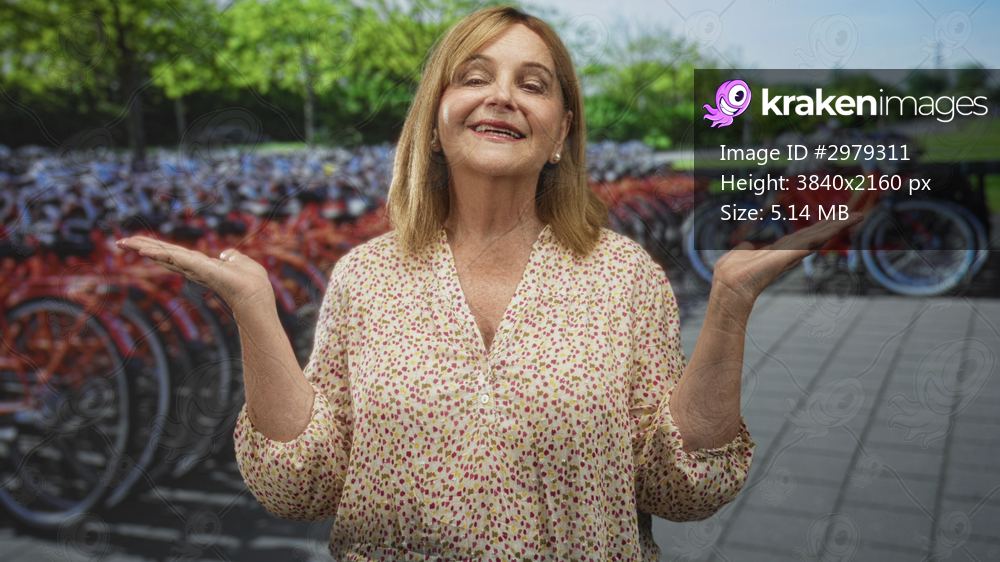Senior woman smiling with palms up, wearing a floral blouse and visible open hands beside a row of rental bicycles parked at a bike rack on street; community optimism. - Kraken Images