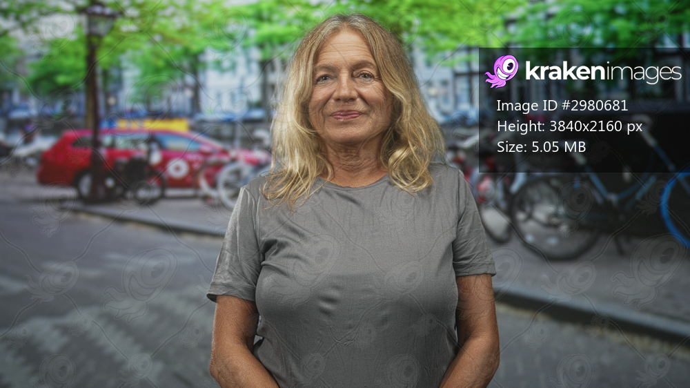 Senior woman standing with eyes closed and hands relaxed near parked bicycles and a red car on a city street; serenity.