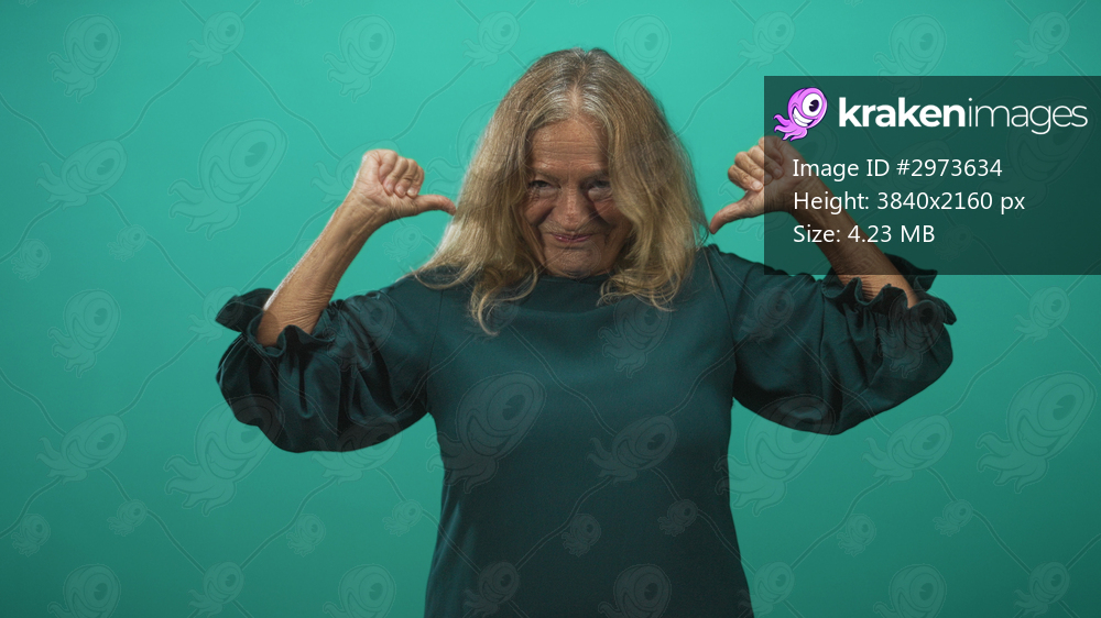 Senior woman with thumbs pointing to chest in teal studio, smiling and raising arms in playful pose; confidence success.