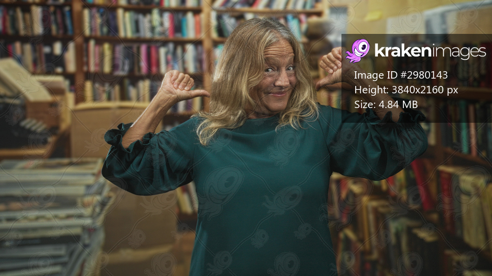 Senior woman thumbs pointing to chest with raised hands among bookshelves in a building; joy celebration.